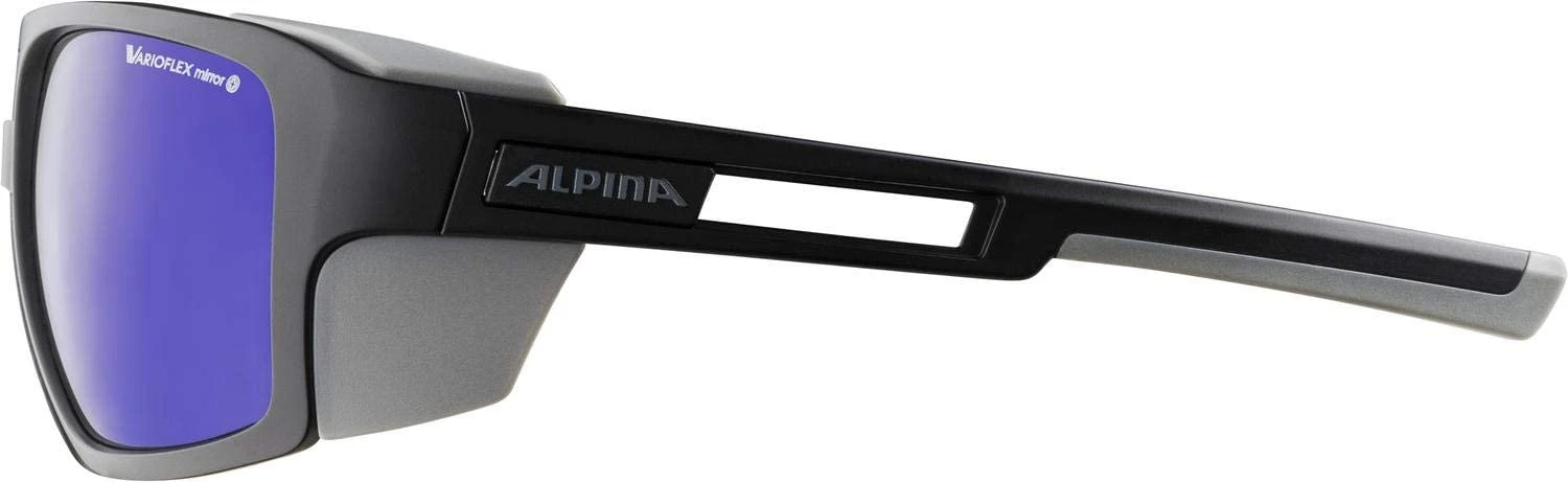 Die ALPINA SKYWALSH VLM+ hat ein selbsttönendes (photochromes) Varioflex-Glas, das die Schutzstufen 1 bis 4 abdeckt. Damit ist bei wechselnden Lichtverhältnissen immer eine sehr gute Sicht gewährleistet und mit der Schutzstufe 4 auch die Gletschernorm erreicht. Klappen an den Bügeln verhindern, dass Streulicht von der Seite einfallen kann – ein zwingend notwendiger Schutz im Hochgebirge und auf Gletschern, um das Auge vor Schädigungen zu bewahren.
